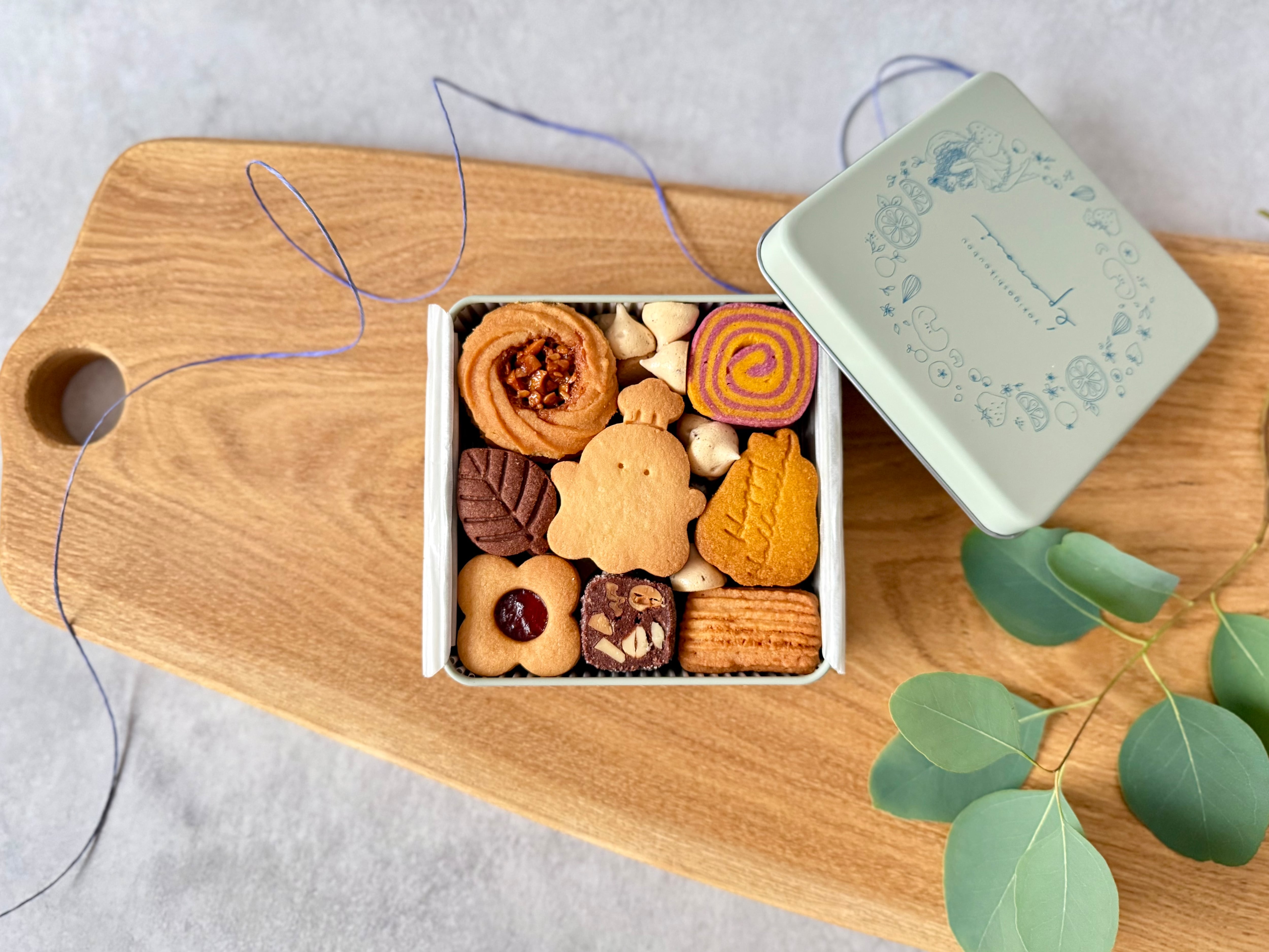 小麦粉(国内製造)、大山バター、きび砂糖、粉糖、鶏卵(平飼い卵)、アーモンドパウダー、ブラウンシュガー、カシューナッツ、オーガニックメープルシュガー、チョコレート、ココアパウダー、アーモンド、クルミ、ピーカンナッツ、マカダミアナッツ、生クリーム(鳥取県産)、かぼちゃパウダー、ヘーゼルナッツ、はちみつ、自家製いちごジャム(いちご、ビートグラニュー糖、きび砂糖、無農薬レモン)、紫芋パウダー、ビートグラニュー糖、ピスタチオ、ゲランド塩/乳化剤(大豆由来)、バニラ香料